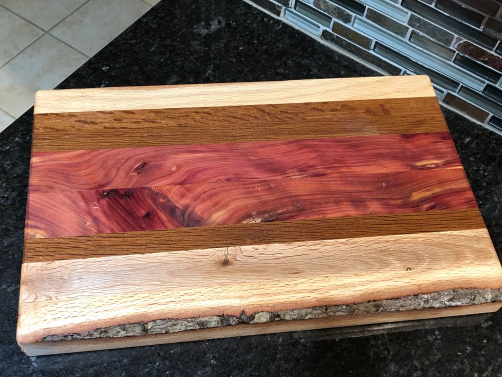 Red oak milled from a tree taken out from Covenant Academy in Cypress, Texas. Purple cedar scraps from sawmill in Magnolia, Texas. Live edge on one side.